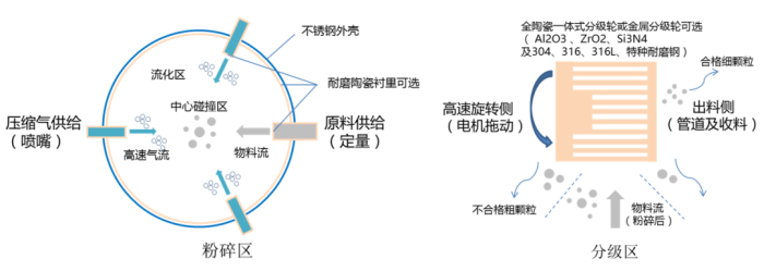 - 利用高壓氣流通過特定噴嘴后產生的高速氣流加速物料,物料流對中撞擊粉碎;
