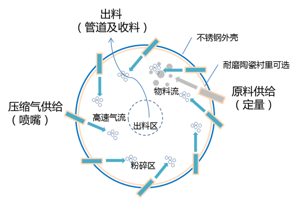 - 利用高壓氣流通過特定噴嘴后產生的高速氣流加速物料,物料沿切線方向形成剪切渦流,在互相碰撞和與中圈的摩擦中被粉碎;