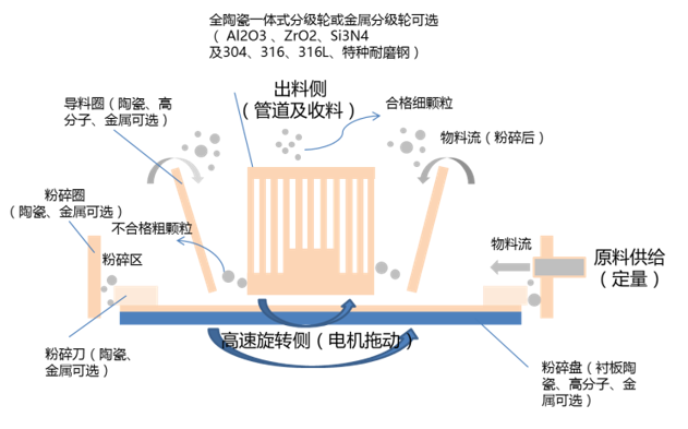 - 利用高速旋轉的粉碎盤上的刀片帶動形成高速沖擊剪切渦流,物料在刀片和固定齒圈之間被粉碎;