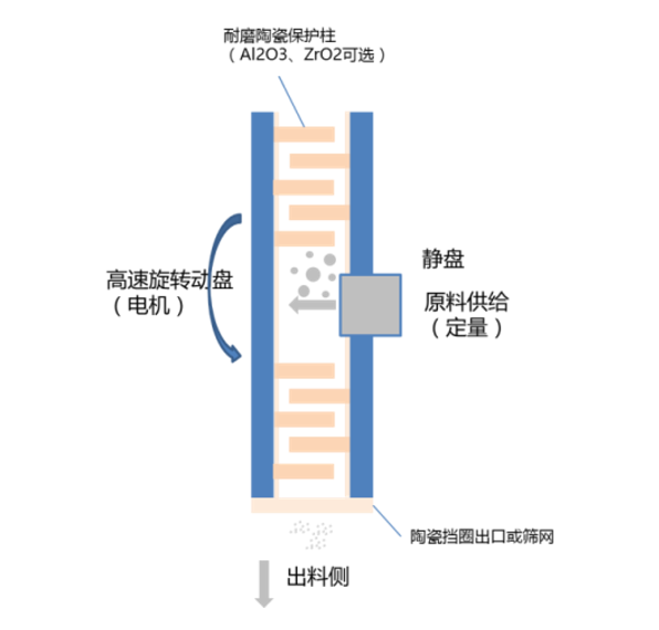 - 利用高速旋轉的粉碎盤上的棒銷帶動形成高速沖擊剪切渦流,物料在動盤和定盤之間被粉碎;