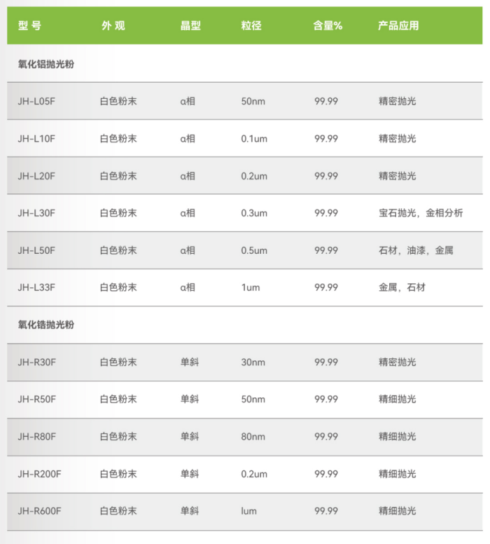 涵蓋氧化鋁、氧化鋯、氧化鈰三大體系,覆蓋粒徑從30nm~3μm,適用于多種材質、多種精度要求的研磨拋光工藝: