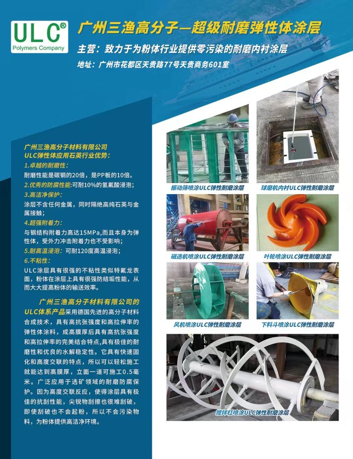 廣州三漁高分子材料有限公司專注可噴涂高分子彈性體材料的研究及開發,引入德國可噴涂高分子彈性體材料生產技術,經過多年國內實踐應用,公司產品已經在多個嚴重磨損領域和重防腐領域得到廣泛的應用,特別是在強酸性或強堿性同時又是磨識嚴重的工況環境下,高性能的高分子彈性體涂層能夠提供卓越的保護。你如重度磨損戰域洗礦設備:磁選機滾筒耐磨保護、清漿泵葉輪及泵體耐磨保護、重型選礦振動篩耐磨保護、浮選槽及浮選轉子浮選軸耐磨保護、螺旋分級機葉片耐磨保護、三通及彎頭形磨保護、玻璃鋼螺旋溜檣耐磨保護、玻璃鋼圓錐耐磨保護等。在自動化領域也有廣泛的應用,例如振動盤耐磨降噪音,耐油重工件振動盤,電子元件防靜電振動盤等。重防腐領域例如硫酸池重防腐、化工廠廢水池重防腐、酸性平臺重防腐、重防腐地坪、化工攪拌槽及攪拌杠重防腐等。大大減少用戶因磨提和腐蝕帶來的損失。