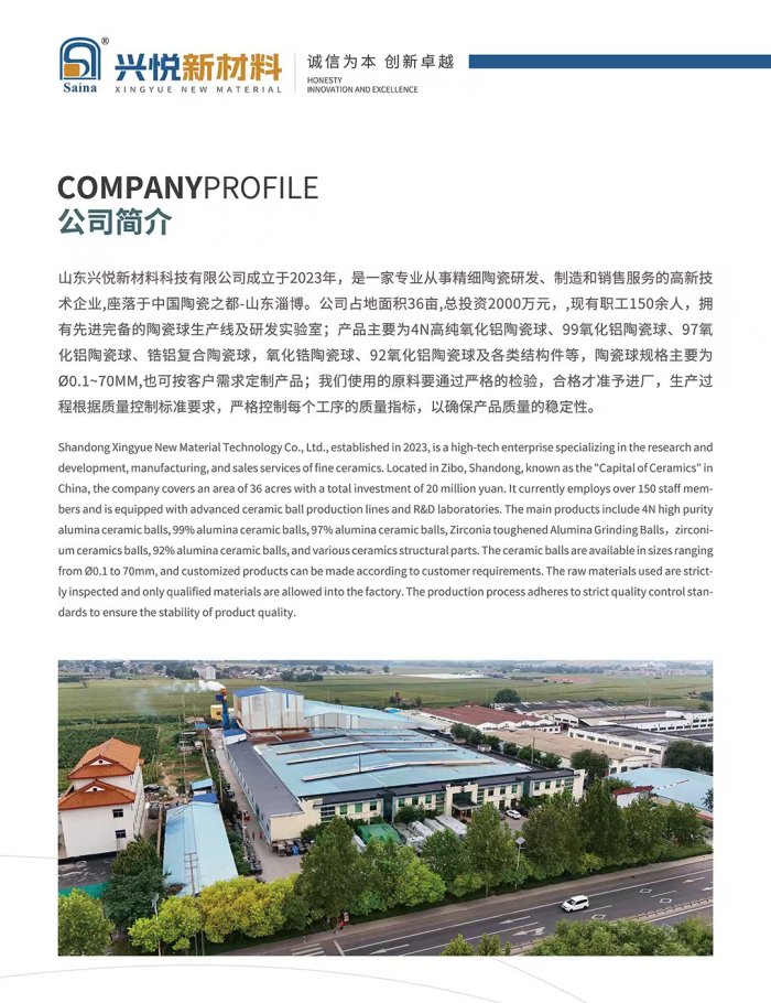山東興悅新材料科技有限公司成立于2023年,是一家專業從事精細陶瓷研發、制造和銷售服務的高新技術企業, 座落于中國陶瓷之都-山東淄博。公司占地面積36畝 , 總投資2000萬元,現有職工150余人,擁有先進完備的陶瓷球生產線及研發實驗室;產品主要為4N高純氧化鋁陶瓷球、99 氧化鋁陶瓷球、97 氧化鋁陶瓷球、鋯鋁復合陶瓷球、氧化鋯陶瓷球、92 氧化鋁陶瓷球及各類結構件等,陶瓷球規格主要為 Ø0.1~70mm, 也可按客戶需求定制產品;公司使用的原料要通過嚴格的檢驗,合格才準予進廠,生產過程根據質量控制標準要求,嚴格控制每個工序的質量指標,以確保產品質量的穩定性。