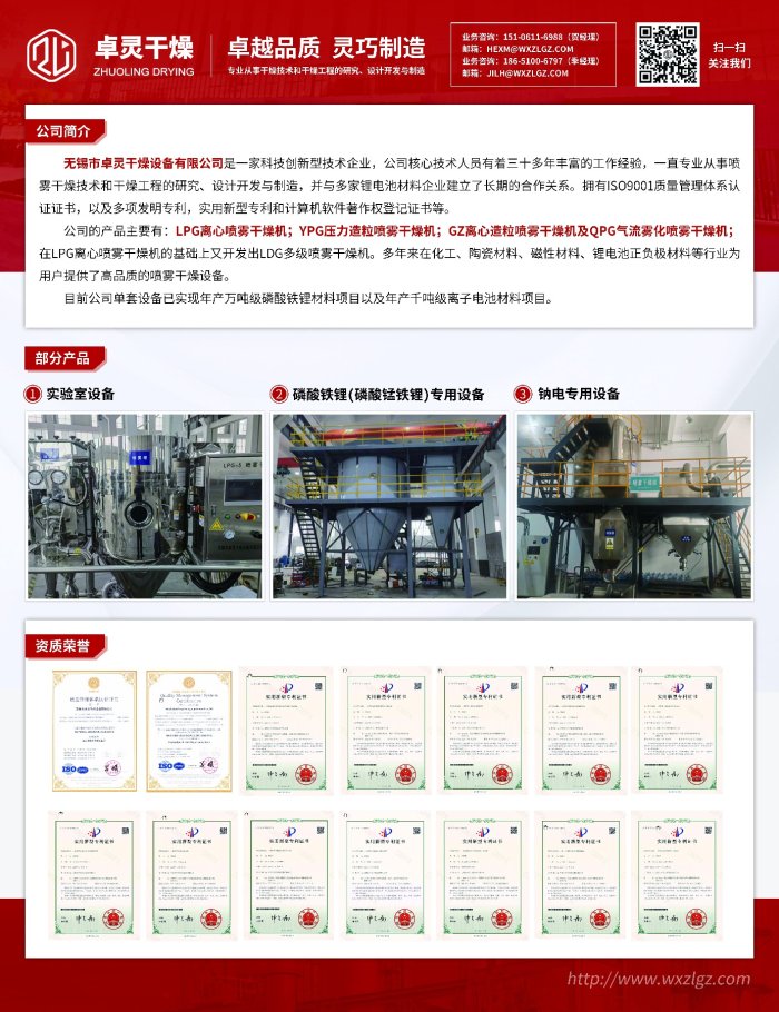 公司主打產(chǎn)品包括:LPG離心噴霧干燥機(jī);YPG壓力造粒噴霧干燥機(jī);GZ離心造粒噴霧干燥機(jī)及QPG氣流霧化噴霧干燥機(jī);在LPG離心噴霧干燥機(jī)的基礎(chǔ)上又開(kāi)發(fā)出LDG多級(jí)噴霧干燥機(jī)。設(shè)備廣泛應(yīng)用于化工、陶瓷、磁性材料、鋰電池正負(fù)極材料等領(lǐng)域,并已成功服務(wù)于年產(chǎn)萬(wàn)噸級(jí)磷酸鐵鋰材料項(xiàng)目及千噸級(jí)離子電池材料項(xiàng)目。