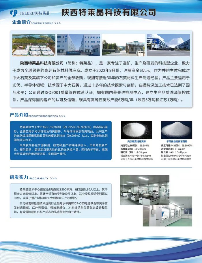 陜西特萊晶項目投資11.6億元,規劃總占地面積 100 畝,用于建設生產廠房、研發及實驗工程中心 、辦公用房及配套設施。陜西特萊晶除了銷售高純石英砂外主要進行光伏石英制品、半導體石英制品的生產。同時,陜西特萊晶建立了工程和技術研發中心,研發半導體級別高純石英砂提純技術和人工合成高純度石英砂技術。
