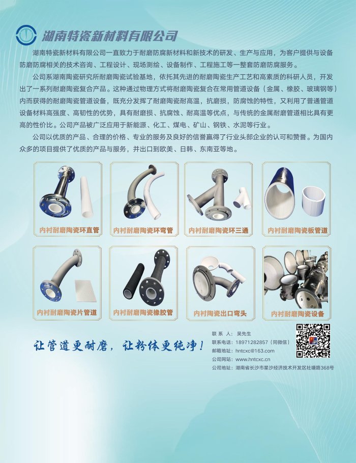 公司系湖南陶瓷研究所耐磨陶瓷試驗基地,依托其先進的耐磨陶瓷生產工藝和高素質的科研人員,開發出了一系列耐磨陶瓷復合產品。這種通過物理方式將耐磨陶瓷復合在常用管道設備(金屬、橡膠、玻璃鋼等)內而獲得的耐磨陶瓷管道設備,既充分發揮了耐磨陶瓷耐高溫,抗磨損,防腐蝕的特性,又利用了普通管道設備材料高強度、高韌性的優勢,具有耐磨損、抗腐蝕、耐高溫等優點,與傳統的金屬耐磨管道相比具有更高的性價比。公司產品被廣泛應用于新能源、化工、煤電、礦山、鋼鐵、水泥等行業。