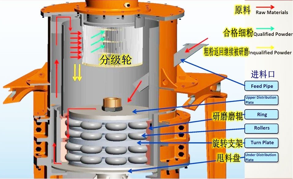 大塊物料經(jīng)錘式破碎機破碎成小顆粒后,由提升機送入儲料倉,再經(jīng)過振動給料機和傾斜的進料管,將物料均勻地送到轉(zhuǎn)盤上部的散料盤上。物料在離心力的作用下散向圓周邊,并落入磨環(huán)的滾道內(nèi)被環(huán)輥沖擊、滾輾、研磨,經(jīng)過三層環(huán)道的加工變成粉體,通過高壓風(fēng)機的抽吸作用將外部空氣吸入機內(nèi),并將粉碎后的物料帶入選粉機內(nèi)。 GYM系列輥壓磨的選粉機內(nèi)旋轉(zhuǎn)的葉輪使粗物料回落重磨,符合要求的細(xì)粉則隨氣流進入旋風(fēng)集粉器并由其下部的卸料閥排出即為成品,而帶有少量細(xì)粉塵的氣流則經(jīng)過脈沖除塵器凈化后通過風(fēng)機和消聲器排出。 性能優(yōu)點: 1、投資省、效率高,與大型成套設(shè)備相比,投資節(jié)省60%。 2、節(jié)能:是當(dāng)前能耗*低的一種細(xì)磨設(shè)備,主機電耗<100kW·h/t。 3、易損件使用壽命長,磨輥、磨環(huán)采用特殊材料鍛制而成,從而使利用程度大大提高。在物料及成品細(xì)度相同的情況下,比沖擊式破碎機與渦輪粉碎機的磨損件使用壽命長2-5倍,一般可達一年以上,加工碳酸鈣、方解石時,使用壽命可達1-5年。 4、破碎比大,能量利用率高。入料粒度<15mm的碳酸鈣,一次加工<10μm的微粉,其中-2.5μm的細(xì)粉占40%左右,比表面積大。它具有高速沖擊式粉碎機生產(chǎn)粉體的高效、低耗的優(yōu)點,而又有接近氣流磨的產(chǎn)品細(xì)度。 5、產(chǎn)品粒度可調(diào),細(xì)度好,是當(dāng)前干法生產(chǎn)非金屬礦細(xì)粉的理想設(shè)備。主機內(nèi)置分級機構(gòu),分級輪結(jié)構(gòu)獨特,不跑粗粉,可根據(jù)需要調(diào)節(jié)產(chǎn)品細(xì)度,它既可生產(chǎn)D97=3-8μm的細(xì)粉,亦可生產(chǎn)D97=10-40μm的粗粉。a性。不用專用混凝土基礎(chǔ)就能安全使用,降低設(shè)備的安裝費用。 7、傳動效率高,主軸采用減速機傳動,其能耗低、效率高,效率≥96%。 8、符合環(huán)保排放標(biāo)準(zhǔn),粉塵排放低于40mg/m3。 應(yīng)用范圍: 1、本機適用于莫氏硬度≤6的脆性物料的粉碎,如重鈣、硅灰石、高嶺土、赤鐵礦、滑石、重晶石、長石、爐渣 等物料的粉碎加工,要求給料粒度不大于15mm,水份小于10%。 2、本機亦可用于不帶膠質(zhì)短纖維物料的超細(xì)粉碎,如木粉加工,要求入料粒度不大于2mm,水份小于5%,粉碎后產(chǎn)品細(xì)度D97=43-860μm。 特別提示:德爾粉體設(shè)備公司的輥壓磨針對人造石墨、核桃殼等輕質(zhì)物料進行了結(jié)構(gòu)優(yōu)化,可大大提高粉碎效率。