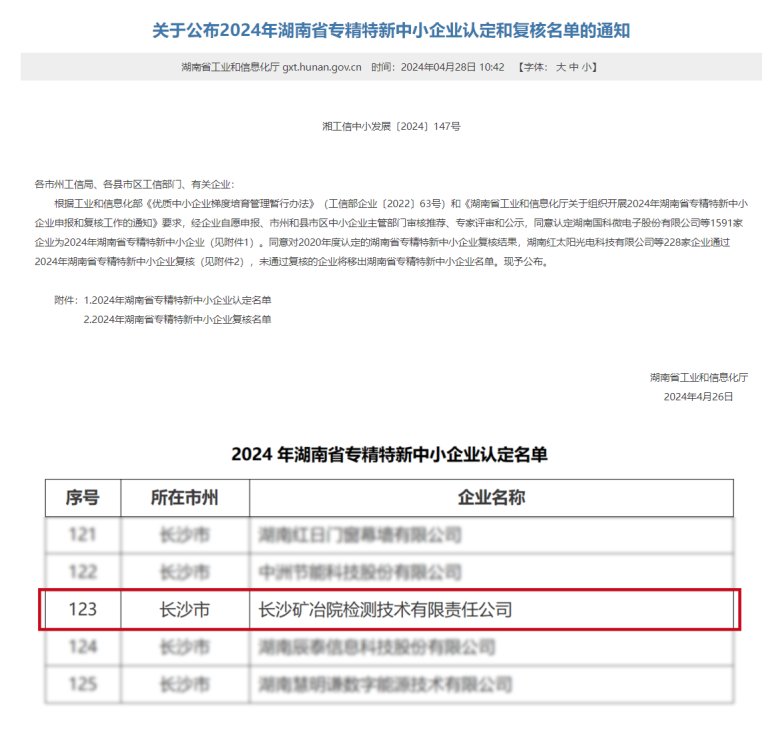 近日,湖南省工業和信息化廳發布了《關于公布2024年湖南省專精特新中小企業認定和復核名單的通知》,長沙礦冶院所屬長沙礦冶院檢測技術有限責任公司成功入選。這是繼貴州金瑞、金爐智能入選國家級專精特新“小巨