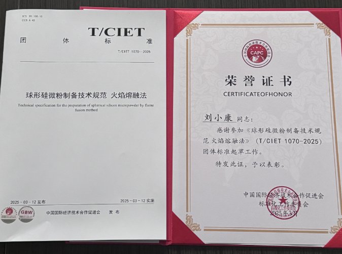 近日,蘭陵縣益新礦業科技有限公司再傳重磅喜訊!公司深度參與并主導起草的團體標準 《球形硅微粉制備技術規范 火焰熔融法》(T/CIET 1070-2025) 正式發布。同時,公司及參與起草的總經理劉小康