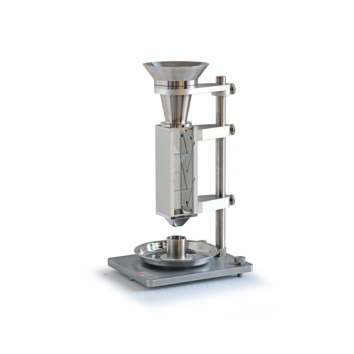 粉體松裝密度的測(cè)試方法和標(biāo)準(zhǔn)很多,由于金屬粉的密度較大,如果像其他粉體那樣直接用漏斗法進(jìn)行松裝密度測(cè)試,則粉末下落的速度較快而形成的沖擊力,將破壞了粉體自然堆積狀態(tài),給松裝密度測(cè)試帶來(lái)較大的誤差。用斯柯特容量計(jì)法的松裝密度儀中間設(shè)立了4道阻尼板,金屬粉末下落的料流將依次接觸阻尼板,延緩了下落速度,減小了沖擊力,從而減少了金屬粉末松裝密度的測(cè)試誤差。