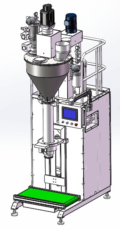 給料裝置采用螺旋加料方式,螺旋選用垂直螺桿結構,螺桿下端懸空有支撐軸,下料過程有粉塵回收功能;可減少包裝粉塵;