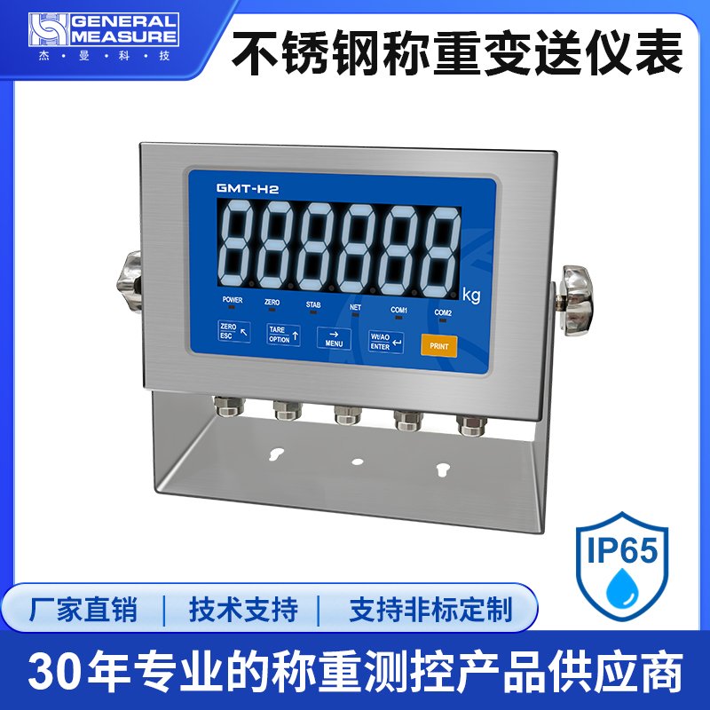GMT-H2是一款基于基本變送功能的稱重儀表,采用不銹鋼防水機殼,防護等級高達IP65,6位2英寸數碼管顯示,清晰直觀。可廣泛應用于鋰電化工、食品醫藥、高端建材、飼料化工、畜牧養殖等行業生產流程稱重環節,如料罐稱重、噸包稱重、配料稱重等場合。