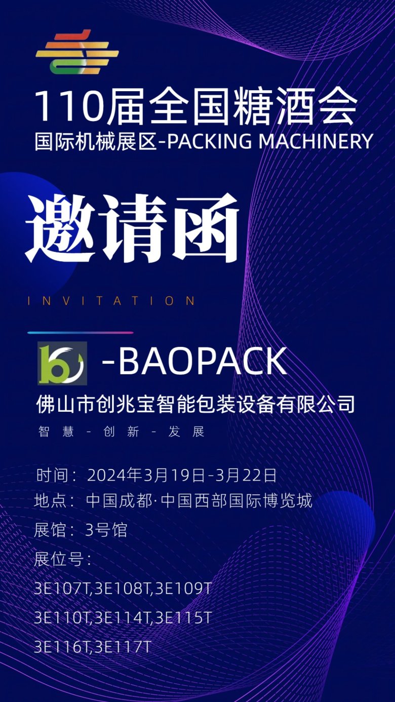 第110屆全國糖酒會,是2024年3月19-22日在成都市中國西部國際博覽城和世紀(jì)城新國際會展中心舉辦的活動。本屆糖酒會規(guī)劃展覽總面積32萬平方米,設(shè)置11大展區(qū)及14個特色專區(qū)。創(chuàng)兆寶誠意邀請您參加