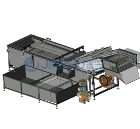 本機分為鼓泡動態清洗、高壓噴射清洗、清水漂洗、氣缸提升裝置等部分。物料投入鼓泡池,物料在鼓泡池前部的噴水管噴射和輸送帶的帶動下向出料端運行,鼓泡池的底部裝有鼓泡管,使物料在鼓泡內不斷的上下翻滾,鼓泡池上部裝有壓料噴射管,壓料噴射管噴出的高壓水可以使一些不易下沉的物料噴到水下。輸送的斜坡端配有高壓管和清水噴射管,物料進過時先進行高壓清洗,去除鼓泡不易去除的污泥,再用自來水噴射清洗干凈。