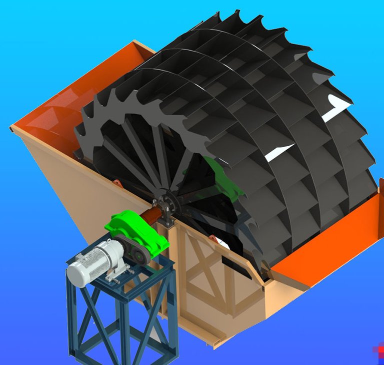 該洗砂機由傳動系統、輪斗、機架等主要部件組成,電動機通過三角皮帶經減速機,小齒輪與大齒輪嚙合,從而帶動輪斗轉動,輪斗把洗砂槽內洗凈的砂子提出,通過皮帶輸送至集料場。
