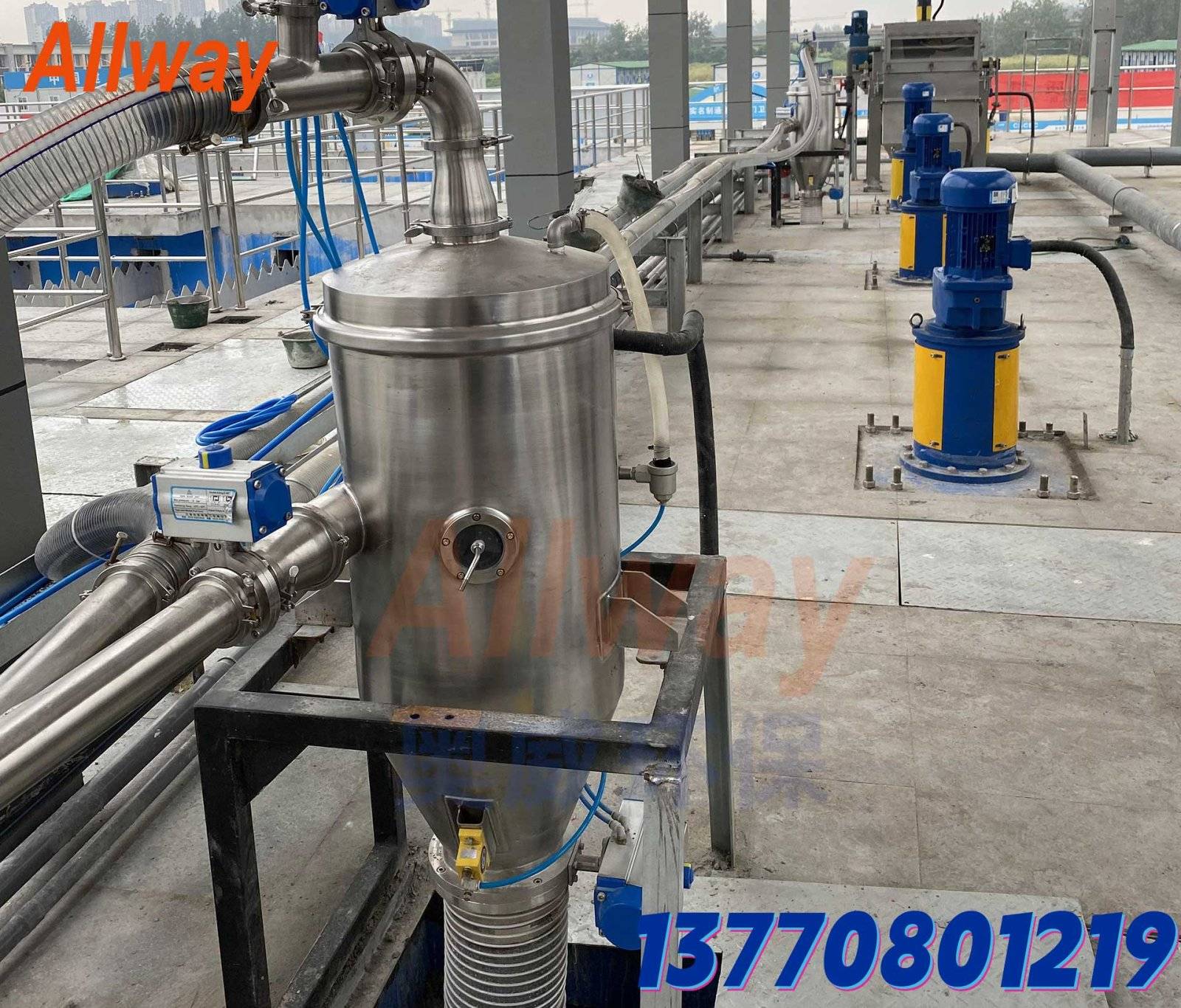 3、氣動控制器控制真空泵關閉時,輸送器內的壓力達到平衡,物料經出料倉輸送到下一個料倉(或反應釜、混合機等)的位置。