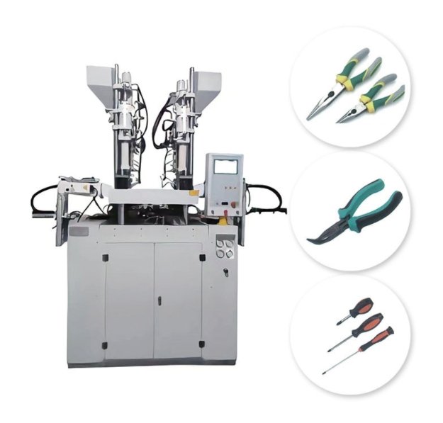該雙色機或者三色機是專門為套柄生產設計的全自動流水線,具有效率高,冷卻到位,適 用范圍廣,模具制造低廉,通用性強等特點,經過實際現場測算, 一個熟練工人可以照看三套 設備, 一個班節省8個人工,目前已被國內較大的套柄企業采納應用。