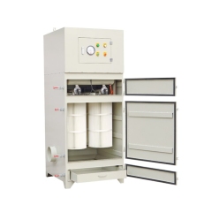 將機組放置獨立的除塵間,配置相應的風管及吸塵罩與除塵器連接,插通電源,開啟風機鍵,含塵空氣從塵源經吸塵罩、風管、進風口進入箱體,因氣流突然護張,流速驟然降低,大粒經粉未在其自重的作用下以含塵空氣中分離而沉降至盛灰抽屜中,其余塵粒由于濾筒的篩濾、碰撞、鉤掛、靜電等作用,被滯留于濾芯外壁,凈化后的空氣由風機經出口排出。本機組凈化后的空氣可直接排放室內循環使用,無通風熱量(冷量)損失。采用自動脈沖清灰,清灰過程中無需停機。