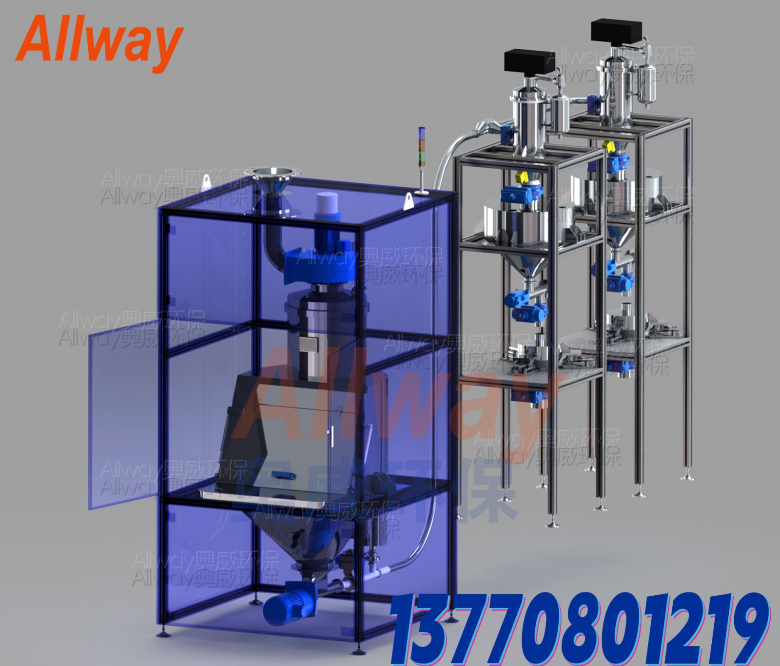 一個集投料、上料、配料、拌料、粉塵回收于一體的小型投喂料系統,通過電氣控制系統,可實現全 (半)自動運行,這是全(半)自動大型系統的初始結構。完善的系統還包含稱重單元、傳感單元等眾多部分,這里就不一一列舉了,具體的和我們的銷售人員聯系,他們會根據您的目標為您提供合理的方案。