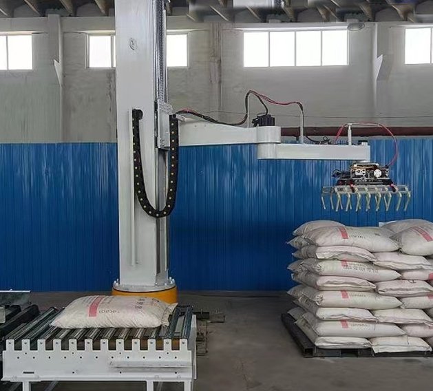 :核心部分,通常采用六軸關(guān)節(jié)式機(jī)器人或?qū)S么a垛機(jī)器人,具有高精度定位、靈活抓取和放置能力。機(jī)器人配備專用抓手(如夾板式、吸盤式、組合式等),適應(yīng)不同規(guī)格和材質(zhì)的飼料包裝。