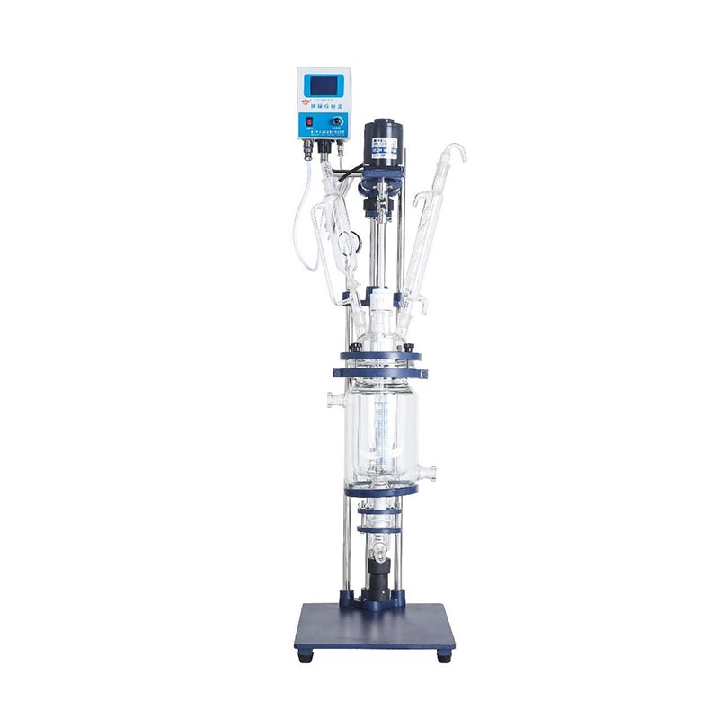 雙層玻璃反應釜具有攪拌系統、冷凝、滴加、回流、收集系統,內層放置反應溶媒可做攪拌反應,夾層通過冷熱源循環,可以提供做高溫反應(**溫度可以達到300℃),也可以做低溫反應(*低溫度可以達到-80℃),物料進行加熱反應時,在真空條件下可以提高蒸發效率(需連接真空裝置),溶媒蒸汽經玻璃冷凝盤管時冷卻成液體(需連接冷卻裝置),可回流到釜內,也可通過回流彎頭下部閥門進行回收。反應完畢,物料可從釜底的側出料口放出。而且全透明的反應過程一目了然,是現代生物制藥,精細化工,新材料合成的理想實驗中試設備。