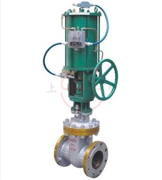 Z641型氣動帶手動楔式閘閥是具有氣動執行機構(雙層氣缸,并帶有緩沖機構)和手動及其保護機構(手動和可自鎖的氣動-手動轉換裝置)的低支架明桿閘閥。該閥門由于采用雙層氣缸結構,其與單氣缸式氣動閘閥相比,提升力增大了一倍。這就從根本上解決了單氣缸氣動閘閥的某些閥體內楔死而打不開的弊病。而且,由于該閥具備緩沖機構,能有效地減速輕了關閉閥門時,由于活塞下行沖擊而造成的閥板車密封面和閥體密封面的磨損,同時,也能避免閘板卡死的現象。