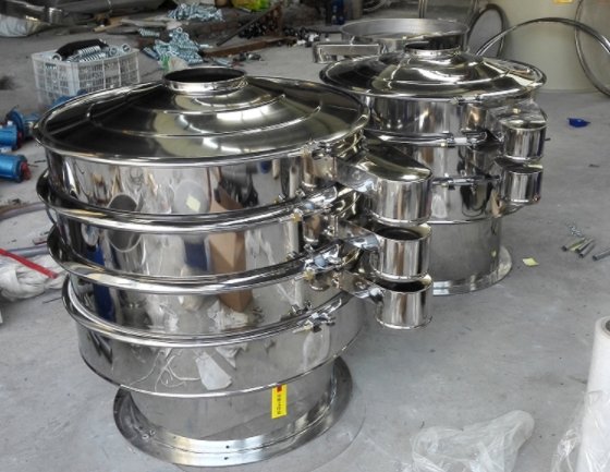 旋振篩是一種高精度細粉篩分機械,其噪音低、效率高,快速換網需3-5分鐘,全封閉結構,適用于粒、粉、粘液等物料的篩分過濾。旋振篩是由直立式電機作激振源,電機上、下兩端安裝有偏心重錘,將電機的旋轉運動轉變為水平、垂直、傾斜的三次元運動,再把這個運動傳遞給篩面。調節上、下兩端的相位角,可以改變物料在篩面上的運動軌跡 電機)、隔振裝置(一組支承彈簧)、底座等幾部分組成,其中,篩蓋與篩框為振動部分,其它部分為非振動部分,另外,底座兼有支承功用。篩框為旋振篩的主要參振部分。篩框通常由板材卷焊而成,其上下端均有一承接圈,下內部設有一法蘭圈,用于固定篩網組件等結構。