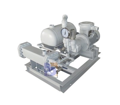 氣體由系統入口法蘭 N1.2 吸入 。氣體被壓縮攜帶部分工作液,通過排氣管線(170)排至分離器(080),在分離器內汽水分離。氣體被壓縮至排氣壓力后,通過法蘭口N2.2排出系統。分離器(080)配帶液位計(230) ,用以指示分離器內液位。