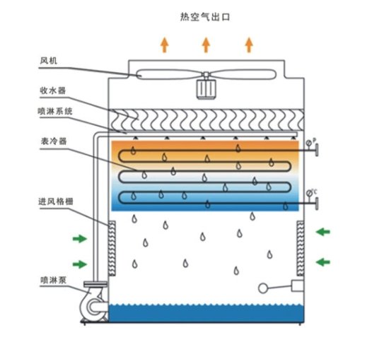 蒸發式冷凝器是制冷系統中的主要換熱設備,它的作用原理是:制冷系統中壓縮機排出的過熱高壓制冷劑氣體經過蒸發式冷凝器中的冷凝排管,使高溫氣態的制冷劑與排管外的噴淋水和空氣進行熱交換。即氣態制冷劑由上口進入排管后自上而下逐漸被冷凝為液態制冷劑。