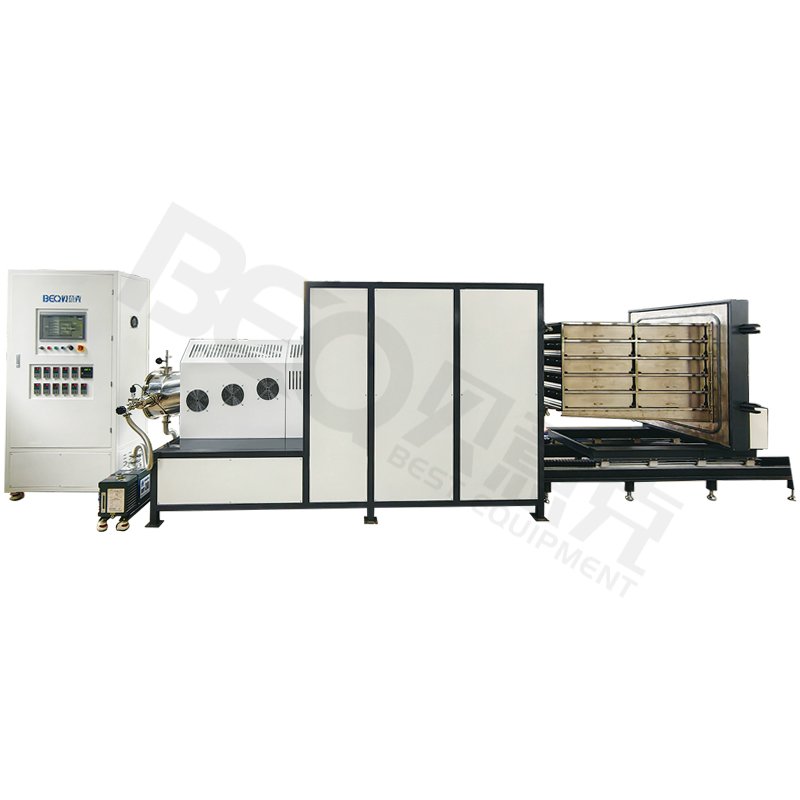 軌道滑動式進出料模式,配備5層加熱托盤支架每一層2個托盤且上下左右密封,且每一層支架配備加熱元器件,加熱溫度可控,且托盤可從托盤支架上自由裝/卸。每一層托盤支架外側配備進氣口,給腔體提供氣流導向。門板與腔體之間采用加裝護照和石墨密封,即可防止材料沉積到門板上,也可維持基礎真空。