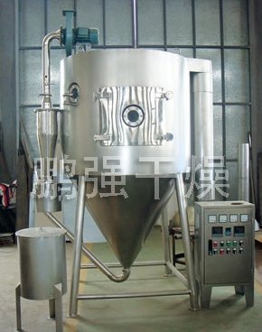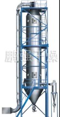 空氣經過濾和加熱,進入干燥器頂部空氣分配器,熱空氣呈螺旋狀均勻地進入干燥室。料液經塔體頂部的高速離心霧化器,(旋轉)噴霧成極細微的霧狀液珠,與熱空氣并流接觸在極短的時間內可干燥為成品。成品連續地由干燥塔底部和旋風分離器中輸出,廢氣由風機排空。