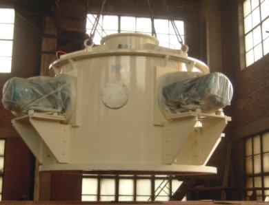 物料在風機抽力作用下由分級機下端入料口隨上升氣流運動至分級區,在高速旋轉的分級葉輪產生強大的離心力作用下,使粗細物料分離,符合要求的通過葉輪進入旋風和除塵器,粗顆粒夾帶細顆粒降至二次風口處,經二次風的淘洗作用。使粗細顆粒分離,細顆粒上升至分級區二次分離,粗顆粒下降至卸料口處排出。