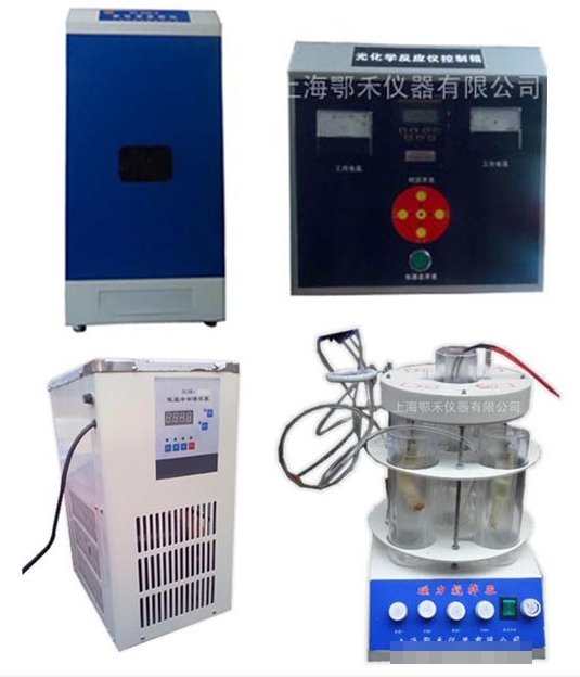 多功能光氧化儀分三大部分組成:A、主體箱采用ABS材料制作、具有防靜電、防輻射功能、前面設有觀察窗、觀察窗具有防紫外線功能、改變以前觀察窗有紫外線傷害人體現象發生、內設有汞氙燈插座各一個、多位攪拌器電源插座一個、后內壁中央位置設有換氣扇、以確保暗箱內空氣流通。箱內有8w可見光、以供在安裝操作時使用,箱體內壁為黑色、以防止光源反射、箱體后壁設有冷阱進水孔、出水孔、試管控溫進水孔和出出水孔、另設有試管沖氣孔一個。箱體后下部設有汞氙燈插座、攪拌器電源插座、可見光風扇插座等。B、多功能光化學合成儀控制箱采用微電腦控時器、可設定工作時間、停止時間、分布定時、以方便工作人員便利、控制器有工作電流表、工作電壓表、便于觀察整機的工作狀態。采用集成式控制方法。內置汞燈、氙燈、金鹵燈鎮流器、以供便利選擇和利用、面板設有可觸摸是按鍵、以便選擇使用、有總電源開關、后下部有汞氙燈出線孔、攪拌器電源線孔、可見光風扇線孔、總電源插座等。