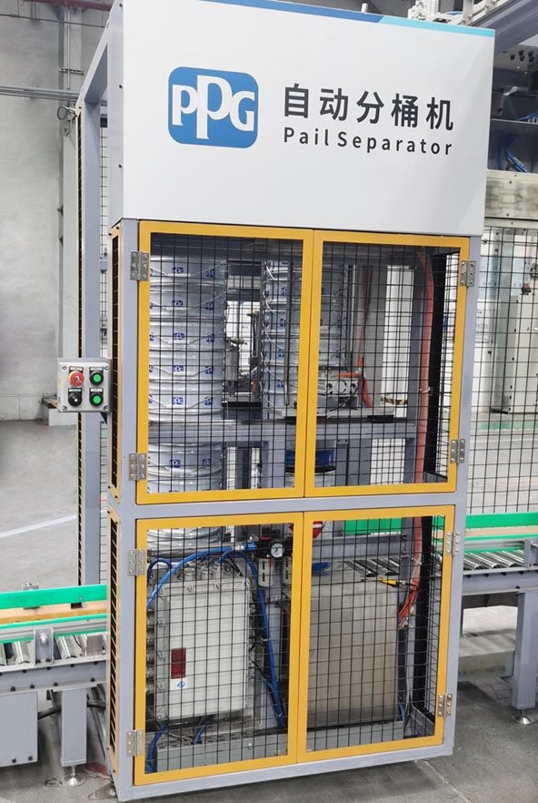 隨著生產企業規模化、自動化的發展趨勢,敞口容器的全自動定量灌裝機生產線的自動化程度不斷提升。桶裝物料全自動灌裝生產線中,操作人員將重疊在一起的單組空桶放在生產線上,通過自動化設備即可實現自動輸送、分桶、灌裝、稱量、封蓋、貼標、碼垛等一系列操作(主要適用于各種涂料、防水涂料、潤滑油、機油等許多液體化學品行業的塑料桶、鐵桶等),此類生產線*前端的設備即為自動分桶機。