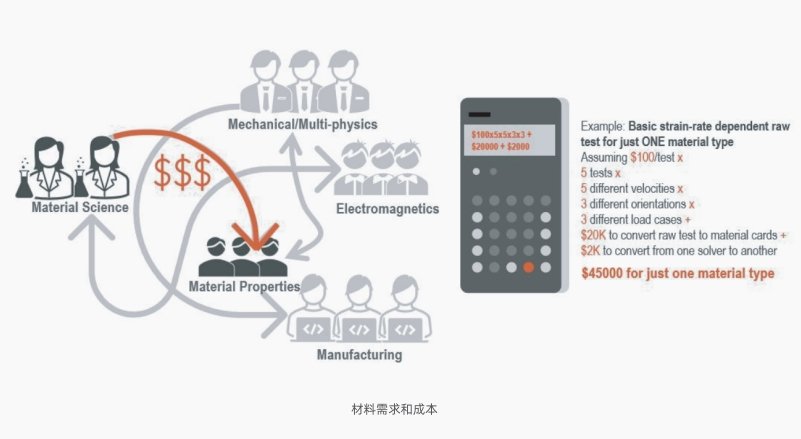 在日常的仿真工作中我們?cè)絹碓秸J(rèn)同材料數(shù)據(jù)的重要性,材料數(shù)據(jù)很多時(shí)候極大的影響仿真的精度,為了提高仿真精度很多企業(yè)成立專門的部門做材料的對(duì)標(biāo)工作,從基礎(chǔ)材料試驗(yàn)到構(gòu)件試驗(yàn)到整體驗(yàn)證,這個(gè)過程耗費(fèi)了大量的**和人力。另一方面我們的材料生產(chǎn)商本身是需要做這些基礎(chǔ)材料試驗(yàn)用于標(biāo)定他們的產(chǎn)品質(zhì)量,但是少有直接提供仿真需要的材料參數(shù)給他們的材料使用客戶。