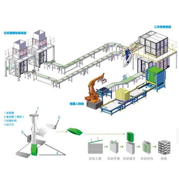 稱量機→立式制袋包裝機→過度輸送機→水平輸送機→雙層傾斜輸送機→高速輸送機→計數理包機→編織袋全自動包裝機→縫包機→編織袋產品輸出。