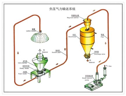 利用風(fēng)機或真空泵抽吸系統(tǒng)內(nèi)的空氣,造成管道內(nèi)的空氣流壓力低于大氣壓力,所以物料同大氣從吸嘴進入管道,隨氣流輸送到終點分離器,在分離器內(nèi)物料受到重力或離心力作用從氣流中分離出來,即所謂的氣固分離,空氣經(jīng)過濾凈化后通過風(fēng)機排放到大氣中。