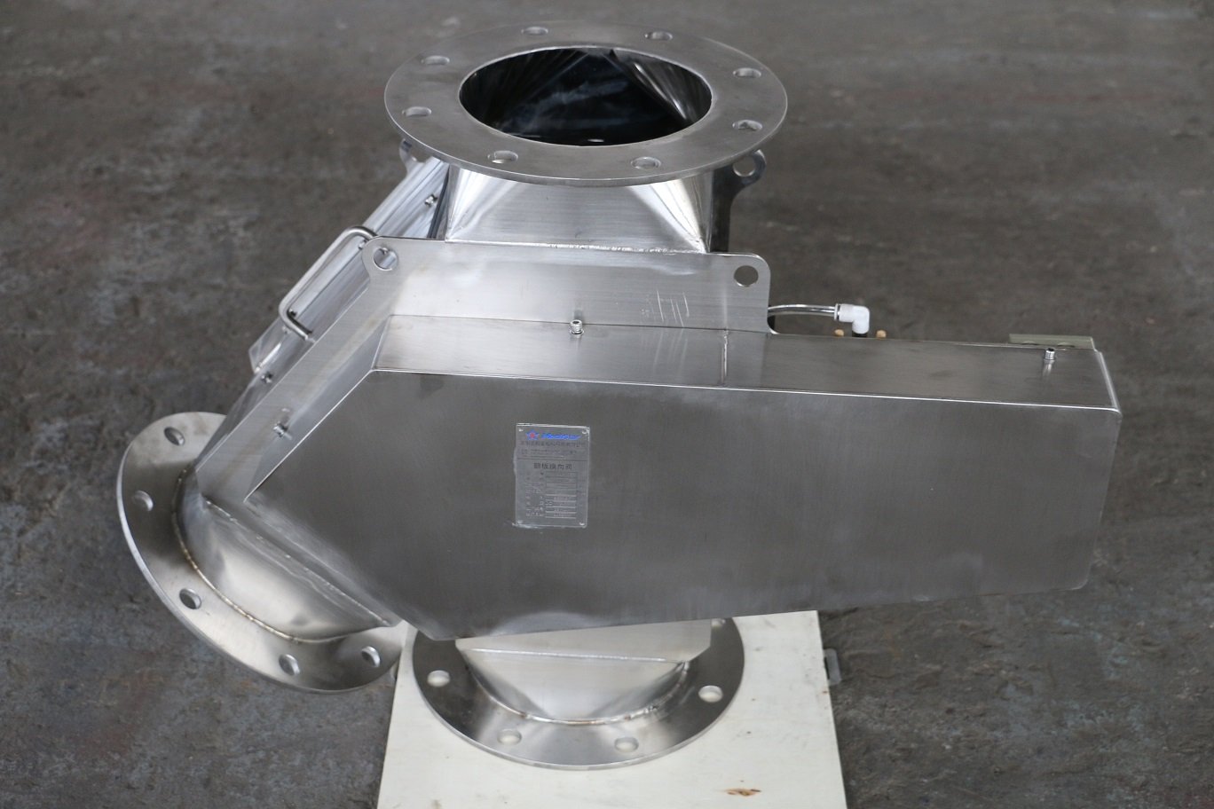 翻板式閥板,可帶料換向。結構簡單,重量較輕,適合于安裝在輸送管線上。可氣動或手動,帶閥板位置信號反饋,帶安全罩。
