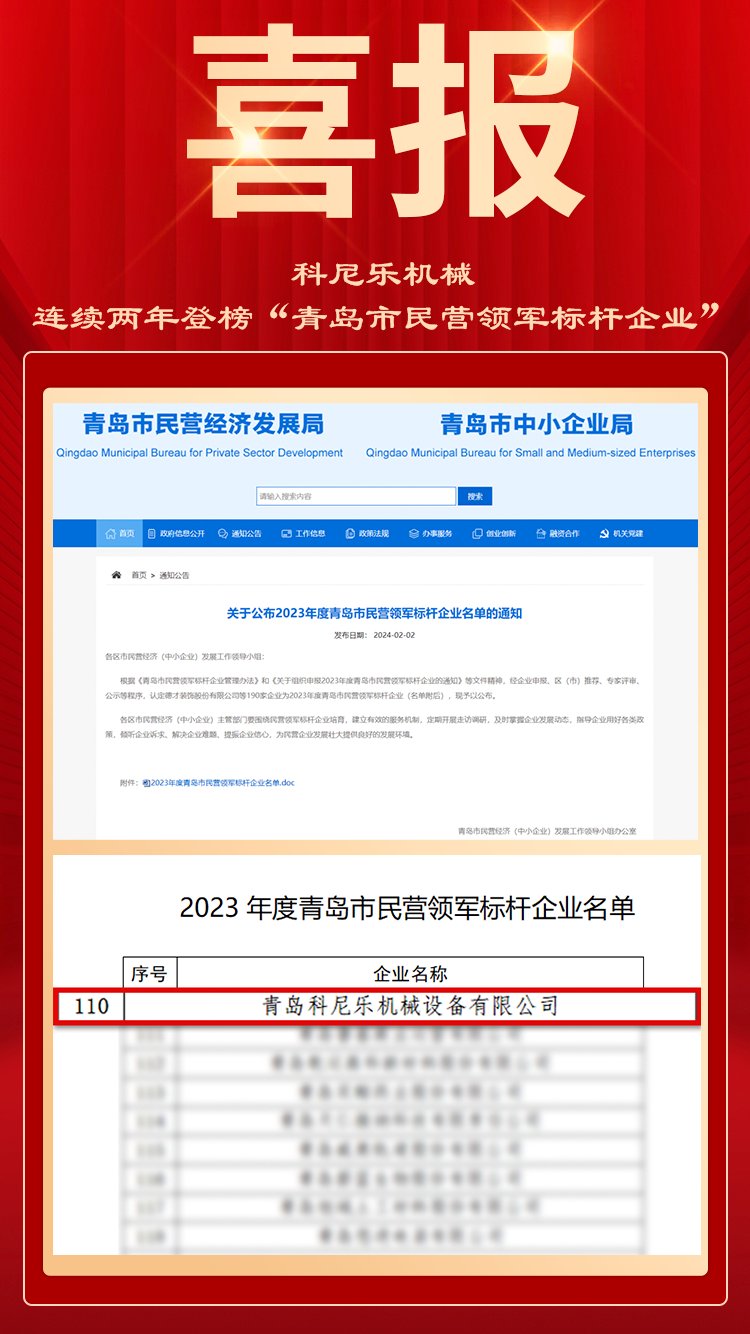 近日,青島市民營(yíng)經(jīng)濟(jì)發(fā)展局發(fā)布了《關(guān)于公布2023年度青島市民營(yíng)領(lǐng)軍標(biāo)桿企業(yè)名單的通知》,科尼樂機(jī)械設(shè)備有限公司榮登榜單,這是繼2022年獲評(píng)“青島市民營(yíng)領(lǐng)軍標(biāo)桿企業(yè)”后,再度獲此殊榮,這是對(duì)科尼樂機(jī)