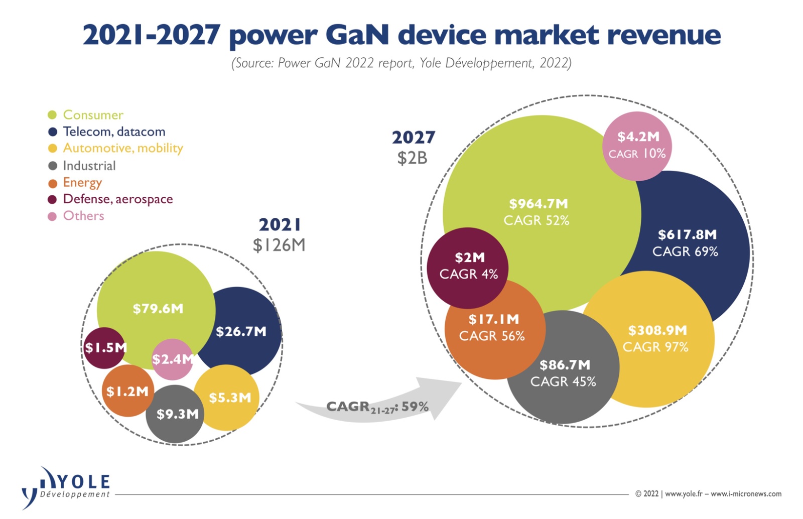 而伴隨GaN技術突破,GaN也在進一步撬動市場,產業規模有望爆發。Yole表示,通信和汽車將助推下一個功率GaN浪潮的到來。Yole預測,2027年,功率GaN市場將達到20億美元,其中,GaN汽車市場價值將超過2.27億美元,2021年至2027年間的CAGR為99%。