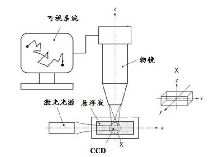 顆粒跟蹤分析技術利用光散射和布朗運動的特性獲得樣品懸浮液中樣本的粒度分布。利用激光光源照射在光學玻璃棱鏡上,光束在液體與棱鏡間發生折射,而顆粒在懸浮液中進行著布朗運動,其隨機運動擴散會導致光散射強度的變化,在可視系統中表現為一個個明亮的光斑,并且可以看到散射光斑也在隨機的運動,散射光斑的中心位置和運動狀態代表顆粒的位置和運動狀態。通過光學放大系統收集每一個顆粒的光散射信號,由相關檢測器(例如電荷耦合元件CCD攝像頭、互補金屬氧化物半導體CMOS裝置)實現顆粒的可視化。攝像頭捕捉一系列顆粒的運動軌跡視頻,分析顆粒的在時間和空間上的運動。