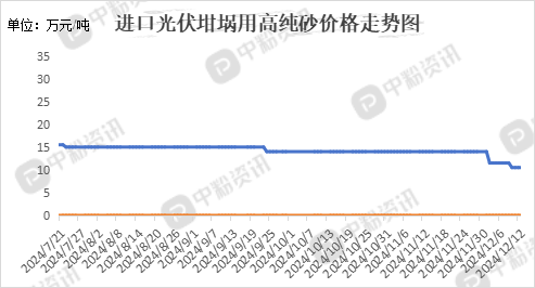 據(jù)中粉資訊,截至12月5日,進(jìn)口光伏坩堝用高純石英砂市場(chǎng)主流價(jià)格呈平穩(wěn),近期有下降趨勢(shì):進(jìn)口的光伏坩堝內(nèi)層用高純石英砂的均價(jià)由14萬元/噸下調(diào)為11.5萬元/噸,環(huán)比上周下調(diào)17.86%。截至12月12日,進(jìn)口的光伏坩堝內(nèi)層用高純石英砂的均價(jià)下調(diào)為10.5萬元/噸,環(huán)比上周下調(diào)25.00%。