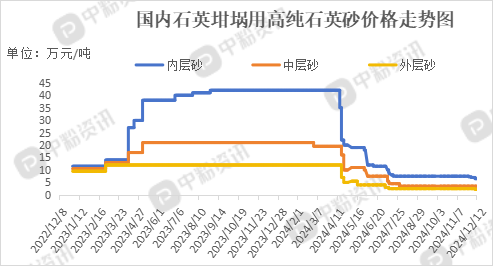 截至12月5日,國內(nèi)高純石英砂(石英坩堝外層用)均價(jià)在2.5萬元/噸左右,國內(nèi)高純石英砂(石英坩堝中層用)市場(chǎng)均價(jià)在3.5萬元/噸,國內(nèi)高純石英砂(石英坩堝內(nèi)層用)市場(chǎng)成交價(jià)在6~8萬元/噸左右。