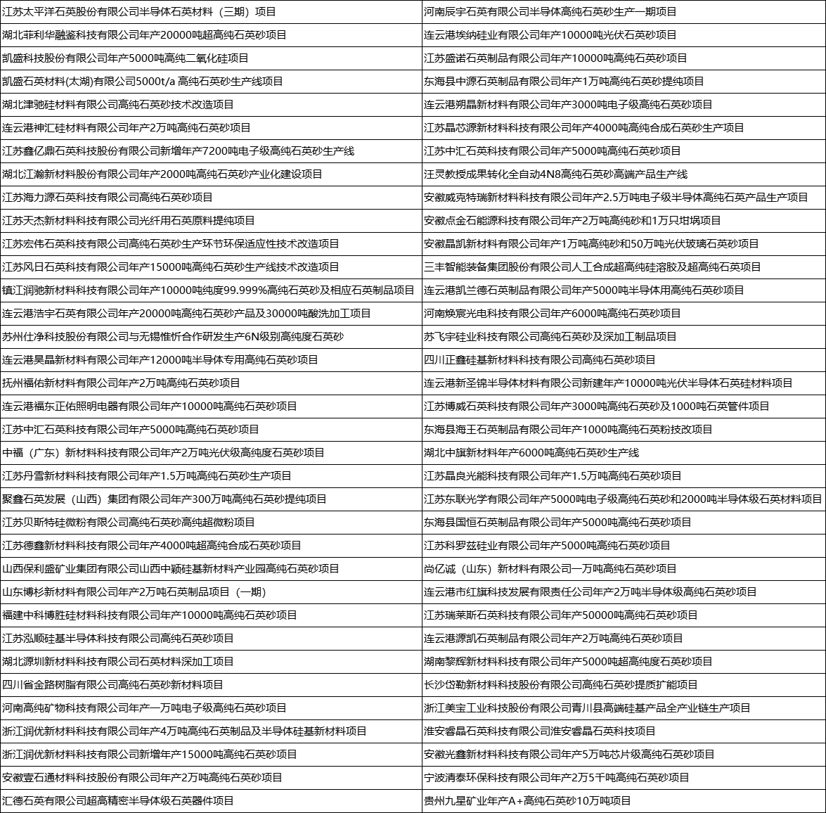 高純石英砂項(xiàng)目(不完全統(tǒng)計(jì))