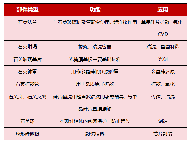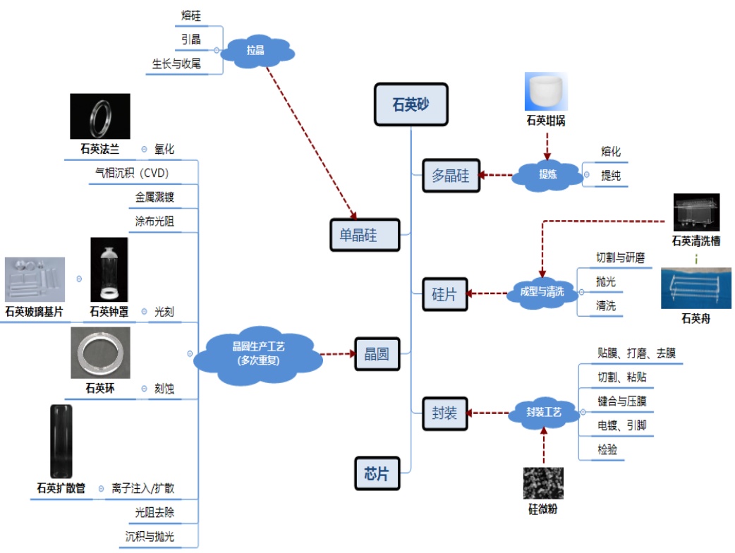 石英制品在下游應(yīng)用廣泛,產(chǎn)品貫穿集成電路產(chǎn)業(yè)的各個(gè)環(huán)節(jié),以石英砂到芯片的生產(chǎn)過程為例,生產(chǎn)過程將使用到石英坩堝、石英鐘罩、石英擴(kuò)散管、石英舟、石英玻璃基片等不同類型的產(chǎn)品。半導(dǎo)體領(lǐng)域加工環(huán)節(jié)在芯片設(shè)計(jì)流程后,可分為三個(gè)階段:單晶硅片制造、晶圓制造和封裝測試。石英材料在半導(dǎo)體產(chǎn)業(yè)的應(yīng)用主要在單晶硅片制造和晶圓制造兩個(gè)環(huán)節(jié)。石英舟、石英管、石英儀器是半導(dǎo)體芯片加工過程清洗、氧化、光刻、刻蝕、擴(kuò)散等環(huán)節(jié)中所需要的材料。