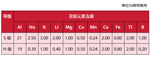 標(biāo)準(zhǔn)級(S級)和高純級(H級)石英舟的雜質(zhì)元素含量(最大值)