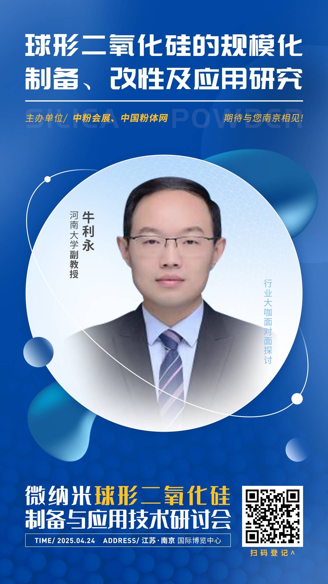 2025年4月23日,由中國粉體網(wǎng)、中粉會展主辦的“微納米球形二氧化硅制備與應用研討會”將在江蘇南京召開,屆時來自河南大學的牛利永副教授,將做題為《球形二氧化硅的規(guī)模化制備、改性及應用研究》的報告。