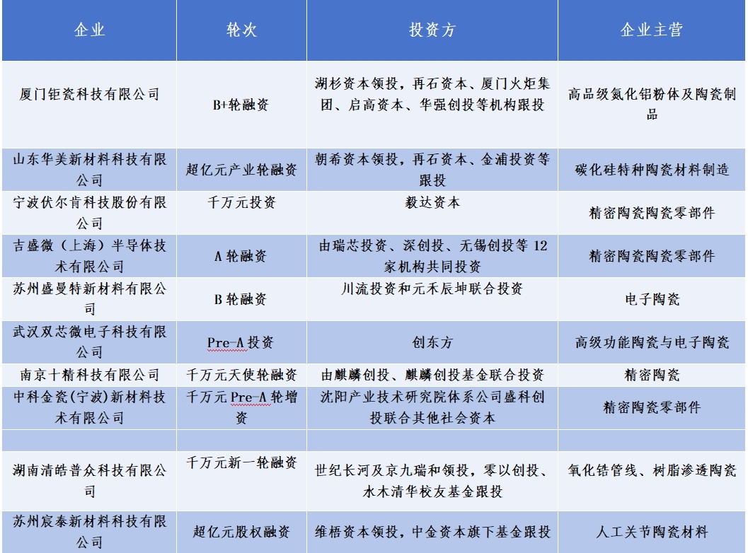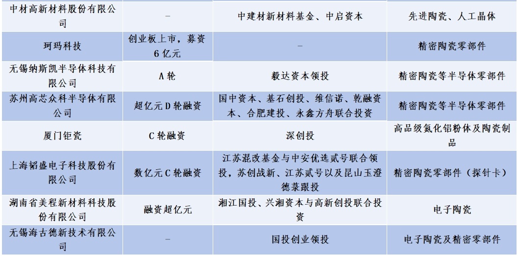 可以看到,精密陶瓷部件是投融資最活躍方向。