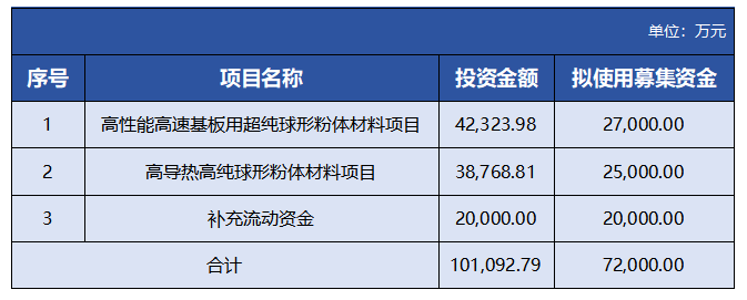 中國粉體網(wǎng)訊 近日,聯(lián)瑞新材發(fā)布公告稱,公司擬向不特定對象發(fā)行可轉(zhuǎn)換公司債券募集資金總額不超過72,000萬元,募集資金凈額將用于高性能高速基板用超純球形粉體材料項目、高導熱高純球形粉體材料項目和補充流動資金。