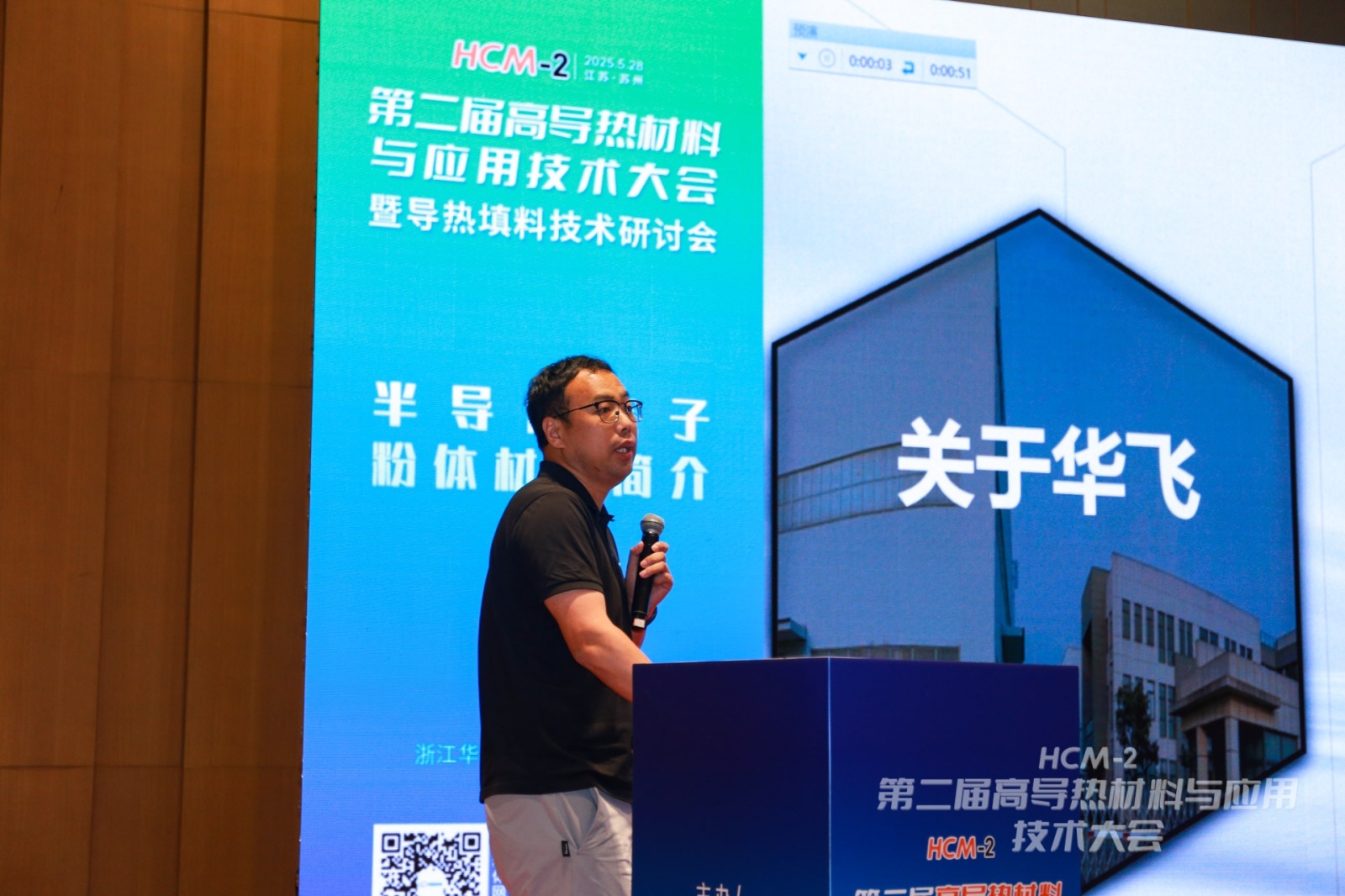 浙江華飛電子基材有限公司銷售經理侯風亮重點闡述了球形二氧化硅、球形氧化鋁等半導體電子粉體的特性指標及其在集成電路、電子封裝等主要應用領域的作用,詳細介紹了華飛高純球形導熱氧化鋁在提升電子設備散熱性能方面的顯著優勢及相關應用案例。